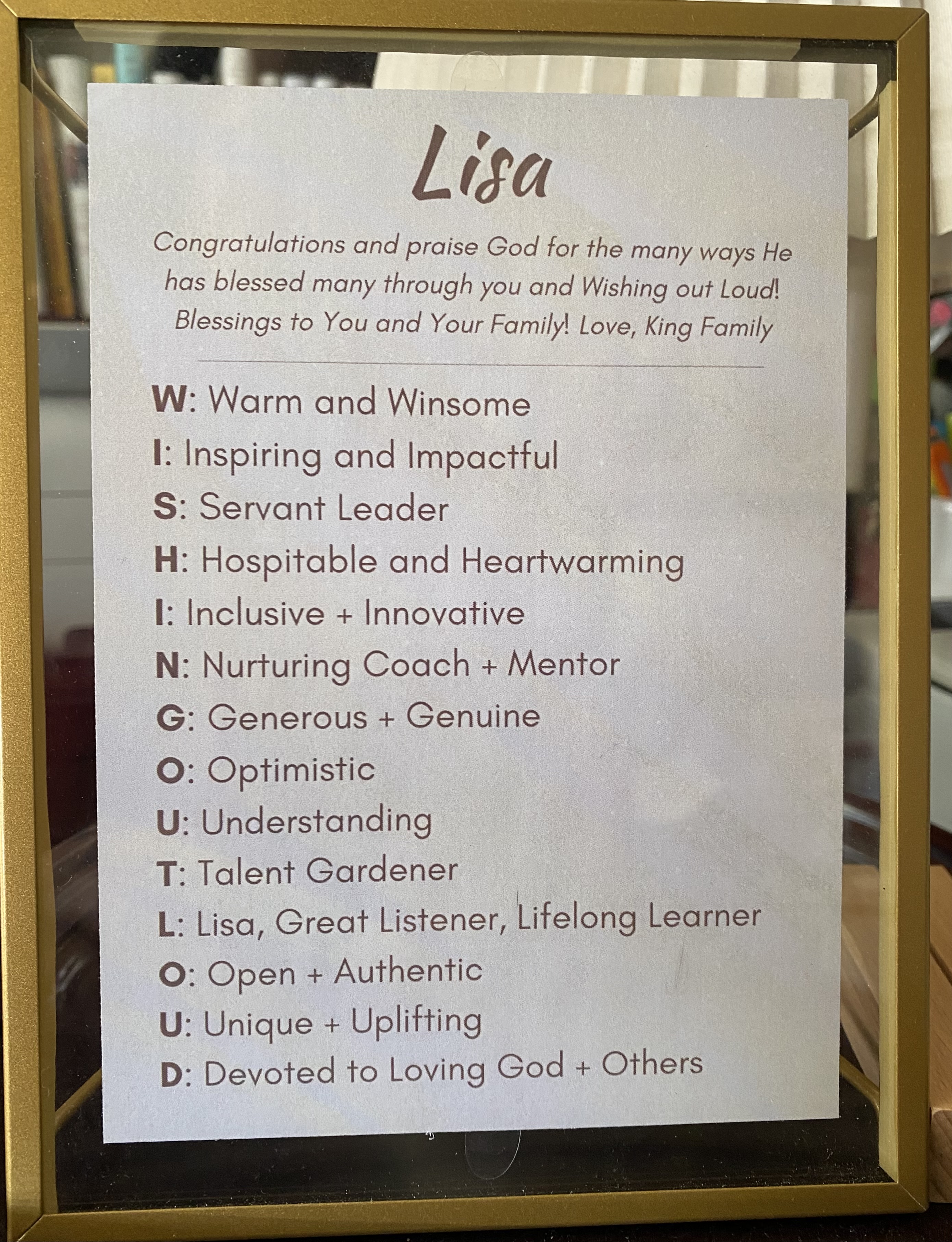 💡 The inspiration? A beautiful gift from my friend Mary Guan—a plaque that spells out “Wishing Out Loud” with affirming words for each letter. It reminded me of the power of name acronyms and how meaningful it is to be seen and celebrated in this way.